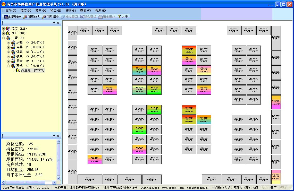 《商貿(mào)市場攤位商戶信息管理系統(tǒng)》 本系統(tǒng)可以適用于各類市場化經(jīng)營場所攤位及商戶的管理、導(dǎo)購。圖形化界面,可以根據(jù)場地實際狀況創(chuàng)建攤位、商戶。圖形創(chuàng)建智能化,直觀、簡便快捷。攤位信息可以包括編號、坐標(biāo)、長寬、面積、樓層;商戶信息可以包括姓名、性別、年齡、證件、電話、主營商品、承租時間、租金、合同(紙質(zhì)合同可以轉(zhuǎn)換為電子文檔方式存儲)等。還有市場經(jīng)營范圍、商戶主營及經(jīng)營商品等信息。本系統(tǒng)包括攤位使用狀......[查看詳細]