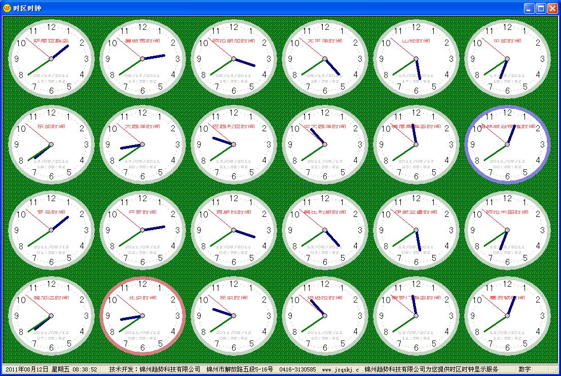 《多時(shí)區(qū)時(shí)鐘顯示》 高檔賓館飯店為方便賓客,均有世界各時(shí)區(qū)時(shí)鐘揭掛。由于各類鐘表走時(shí)精度所限,提供的時(shí)間精度不足,時(shí)有誤差偏大表現(xiàn)。本系統(tǒng)利用計(jì)算機(jī)外接一塊較大屏幕(或各房間媒體終端),可以任意設(shè)置全世界各時(shí)區(qū)時(shí)鐘表達(dá),單屏可設(shè)8~24塊,靈活方便。還有北京時(shí)間整點(diǎn)語(yǔ)音(音樂(lè))報(bào)時(shí)功能。同時(shí),亦可穿插通知、通告;公益、商業(yè)廣告等服務(wù)內(nèi)容,成為賓館飯店的資訊窗口。歡迎到本站【下載專區(qū)】下載安裝程序。......[查看詳細(xì)]